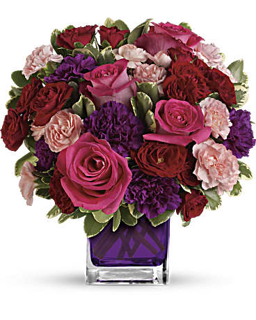 Pure romance. Hot pink roses and dark red spray roses are brightly arranged inside a glass cube.