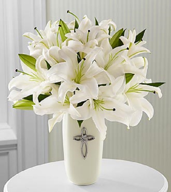 This striking display of pure white lilies will send your heartfelt expressions when words just aren’t enough. Arranged in a white ceramic vase and enhanced by a cross, this arrangement is perfect for celebrations, confirmations, sympathy, weddings, or a special anniversary.This is an all-around arrangement.