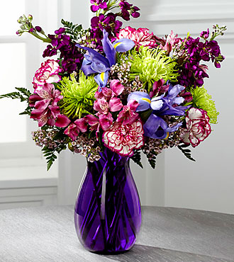 Blooming with rich color and undeniable texture, this stunning bouquet expresses love and gratitude with each perfect flower. Blue Iris, fragrant purple gilly flower, purple Peruvian Lilies, purple bi-color carnations, green spider chrysanthemums, clusters of pink wax flower, and lush greens create a fascinating display presented in a deep purple glass vase with modern lines to create a sophisticated look.