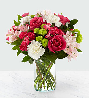 The true beauty of this bouquet is within the sweet colors of the flowers. An array of hot pink roses, pale pink alstroemeria and more are set in a glass cylinder vase, making a wonderful gift to light up the face of its recipient.