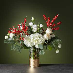 String boughs of holly throughout your home with our Winter Forest Bouquet. Anticipate dynamic movement with a diverse gathering of white roses, hydrangea, lisianthus, crimson ilex berries and wooded greenery for a dazzling holiday.