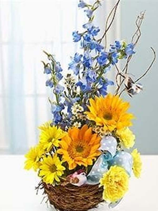 Capture their inner nesting instinct with this Welcome to the World Arrangement sure to delight the new parents. A charming bird’s nest basket is filled with a beautiful baby blue and yellow-themed arrangement of delphinium, sunflowers, carnations and daisy poms. This arrangement comes accented with a beautiful blue polka dot ribbon and a pair of playful bird picks.